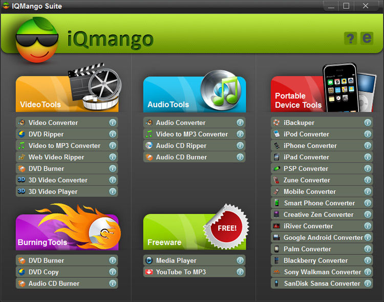 Download IQmango Pack of 31 free apps! Audio converters, video converters, CD burners, DVD burners, iPod/iPhone/iPad backup tools, portable device converters and more. Best quality. All 31 apps are FREE to download, install & use. Enjoy IQmango Pack! The amazing set of free multimedia tools include: Audio CD Burner, Audio Converter, Video Converter, 3D Video Player, 3D Video Converter, DVD Burner, iBackuper, DVD Ripper, Video to MP3 Converter, DVD Copy, iPad Converter, SanDisk Sansa Converter, iPhone Converter, Sony Walkman Converter, iPod Converter, Blackberry Converter, PSP Converter, Palm Converter, Zune Converter, Archos Converter, Mobile Converter, Android Converter, Smart Phone Converter, iRiver Converter, iBackuper, Creative Zen Converter, Audio CD Ripper and other free cool applications.