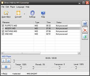 Direct MIDI to MP3 Converter is a fast audio tool to convert MIDI to MP3, WAV, WMA and OGG files formats. Our audio converter can quick render the MIDI file into an audio format that you can burn on an audio CD and play on a regular CD player. An essential difference between Direct MIDI to MP3 Converter and other similar programs is that our MID Converter provides direct MIDI conversion (rendering) without sound recording. The main advantages of direct MIDI conversion are the CD audio quality, the conversion speed and the silence during conversion. You don't need to listen to the MIDI music and adjust recording level while converting. Just drag and drop your MIDI files and the rest are done automatically by Direct MIDI to MP3 Converter. Conversion speed is up to 10 times faster then original midi file time! Musicians can use own SF2 soundfonts for rendering and change the instruments quality. A built-in audio player (with trackbar) helps you pre-listen to MIDI, MID, RMI or Karaoke files before converting. And the built-in easy-to-use OGG/WMA/MP3 Tag Editor helps you name your MP3, WMA or OGG tracks. The batch mode helps you simultaneously convert multiple MIDI tracks to MP3. The batch MIDI to WAVE conversion is very useful for creating musical collections on an audio CD. The resulting WAV or MP3 files can then be burned to an audio CD using any CD recording program. Or you can download it to your Apple iPod or other portable MP3 player. Using the Tempo change feature, you can create an album of your favorite MIDI or Karaoke MIDI compositions performed in any tempo. Quality options are adjustable. You can convert your favorite mobile phone MIDI ringtones to MP3 with adjustable reverberation. Direct MIDI to MP3 Converter is a great choice for MIDI artists, and amateur or professional musicians who compose MIDI music using digital pianos, keyboards or music sequencers and need a tool to convert MIDI (MID, RMI, KAR) files to popular audio formats.