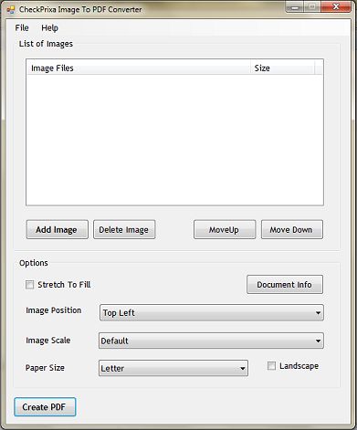 CheckPrixa Image To PDF is a free tool that converts image files to PDF. It is a well tested, fully functional converter capable of handling heavy workload and delivering professional results. The simple user interface allows immediate productive usage upon download and installation. Especially useful for making PDFs out of screenshots, combining photographs into a nice catalog, or turning image scans into an ebook, this powerful software will quickly get the work done without any hassle.
