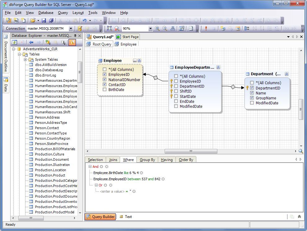 dbForge Query Builder for SQL Server is a solution for quick creation of queries and extended data management. It allows you to effortlessly create any complex queries to SQL Server databases.