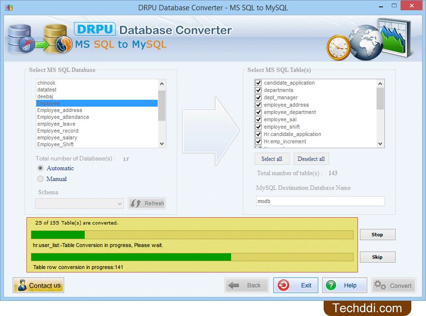 MSSQL to MySQL Database Converter Software provides complete solution to convert whole Microsoft SQL database records into MySQL database records within few simple steps. Software easily converts views, stored procedures, indexes with all necessary attributes, queries, foreign keys etc. MSSQL to MySQL converter software provides facility to connect MSSQL and MySQL server locally or remotely. Database conversion program is capable to perform database conversion accurately in both cases when user want to export MSSQL database into new MySQL database or overwrite contents of existing MySQL database. Software provides two options Automatic and Manual for converting database records, in manual mode you can select schemas manually.