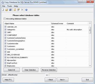 Copy database function for Microsoft SQL Server allows the user to create a copy of all or selected tables to another database or server. A few options like rows selection or "identity copy mode" make copy process more flexible. This handy utility helps database developers, advanced users or database administrators to create a second copy of a database within seconds. The program has easy to learn and to use wizard interface, built-in and online help.