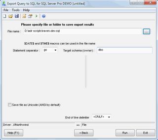 Export Query to SQL for Microsoft SQL Server helps to save results of a query execution as a set of INSERT SQL statements. Predefined or cusrtom separators like 'go', two identity support modes and a few options make this tool flexible. The program has easy to learn and to use wizard interface. This handy utility helps database developers and database administrators to create query-based SQL script within seconds.