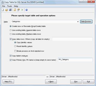 Copy table function allows you to create copy of selected table (definition and data) to another database or Microsoft SQL server. A few options like rows selection or "identity copy mode" make copy process more flexible. This handy utility helps database developers, performance tuners and database administrators to create a second copy of a table within seconds. The program has easy to learn and to use wizard interface, built-in and online help. The copy utility is a true Unicode Win32 application that compatible with all modern versions of Microsoft Windows.