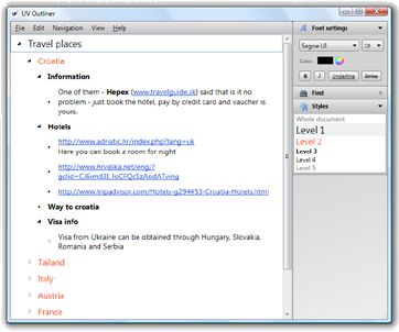 With UV Outliner you can create plans, schedules, and to-do lists, manage notes, collect and organize ideas, brainstorm, plan your trips, record meeting minutes, track expenses, write novels and much more.
