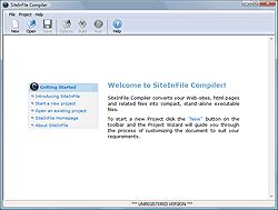 Create professional presentations, cd autoruns and eBooks using SiteInFile technology. SiteInFile Compiler compress HTML pages or entire site with all resources (include HTML, CSS, WAV, TXT, JPG, GIF, JavaScript, PNG, etc.) into a single compact file with built-in browser. All content will be protected from copying (no temporary files during execution!). SiteInFile Wizard will guides you through the process of customizing the publication to suit your requirements.