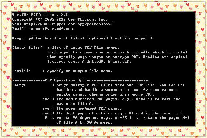 VeryPDF PDF Toolbox Shell for Linux is a terminal program for Linux, and it is a very powerful and useful application. With PDF Toolbox Shell for Linux, you can merge, split, remove page, export page, encrypt, fill form, edit description information of PDF, and even repair damaged PDF, optimize PDF. As a terminal based program, it can easy to perform batch process within shell script. Feature of VeryPDF PDF Toolbox Shell for Linux: 1. Support terminal command operations. 2. Extract and remove pages from PDF. 3. Merge multiple PDF to one. 4. Split one multipage PDF to single page PDF. 5. Use FDF file to fill PDF form. 6. Use image in PDF to add watermark and stamp to PDF. 7. Extract and compact PDF description. 8. Attach or detach PDF attachment. 9. Compress stream objects of PDF. 10. Remove known PDF password. 11. Set password to protect PDF. 12. Restore content from damaged PDF.