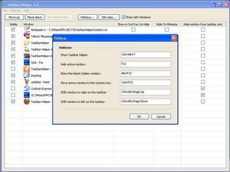 Taskbar Helper is designed to help users eliminate clutter in the taskbar when many applications are open on the desktop. Once installed, the utility lets you hide applications from view, or minimize to the system tray (near the system clock). You can hide or minimize windows using the GUI interface, or hotkeys. The program also allows you to set up rules to automate operations with selected windows.