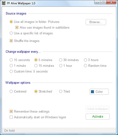 Turn your boring desktop into a living slideshow with this featureful freeware! PF Alive Wallpaper gives life to your desktop by automatically changing your Windows wallpaper after some time. Features include custom folder selecting or building a list of wallpapers yourself; you can also specify the delay, the position and the background color of every image (or use general settings). The program supports all popular image formats and more!