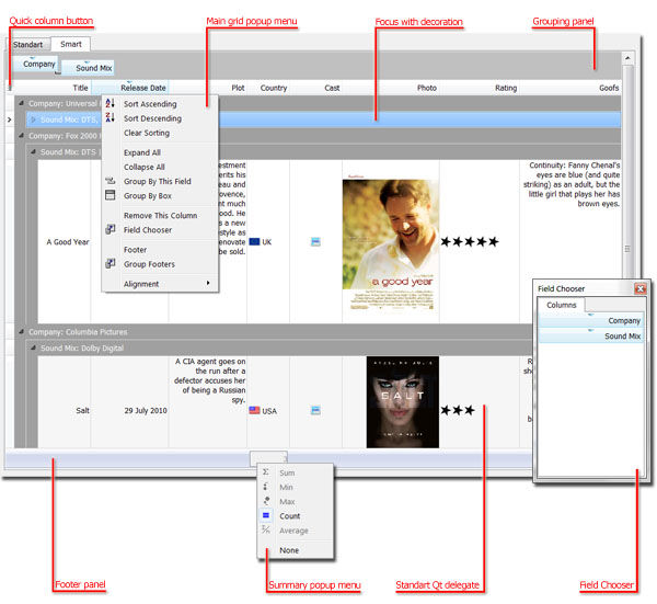 QtitanDataGrid is by far the fastest grid component for Qt on the market. It's a unique data library (third-party Qt widget) for Nokia-Qt that provides the same level of development comfort and functionality as its Delphi and .NET counterparts. The library smoothly integrates into QtDesigner and allows you to use its advanced data management features right "out of the box". QtitanDataGrid takes the functionality of QTableView to a new level by offering an array of unique features. With this component, you'll be able to dynamically load different types of data into an editable and highly flexible data grid that supports grouping, sorting, banded columns, summaries and a lot more! Developers with substantial .NET/Delphi background will be pleasantly surprised to see the same level of functionality that was available in their familiar IDE's. The use of QStyle for rendering grid elements ensures seamless visual integration into any program.