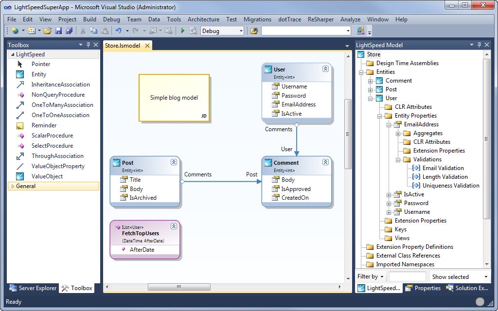 Save time - from no code to a working domain model in 10 minutes with the rich Visual Studio 2008 & 2010 integrated LightSpeed Designer. Create entities, drag and drop tables from your database, add rich validation and round-trip updates to and from your database.