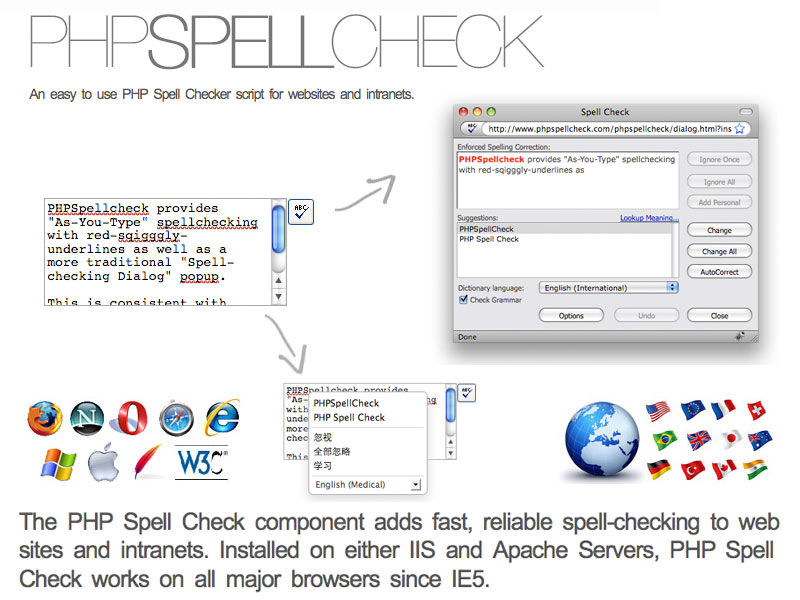 DEVELOPER FRIENDLY * Copy & Paste Installation on Mac , Windows IIS/Apache & Linux Apache. * Hello World in minutes. * No PSpell or ASpell required on your server * Broad Compatibility with all major web browsers including Internet Explorer, Safari, Gecko, FireFox and Mobile Browsers. * Well Documented PHP and JavaScript APIs * Lots of Tutorials With Source Code at http://www.phpspellcheck.com