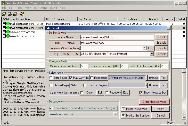 Monitors Internet Services and alerts the user with a variety of methods if down. Always know whether or not your web site or other network services are up or down with First Alert Service Monitor.First Alert Service Monitor will check your site or other services as often as you have it configured to. If one of your services stops responding, you will be notified in the ways you have configured and the down time will be logged. If you pay a firm to host your site or service, you should be able to get at least a partial refund from your site hosting company if any serious down time occurs. Save money with First Alert Service Monitor! If one of your Internet Services goes down, you will be alerted by any or all of these many alarms. Select Alerts include: [Error Sound], [Plays your choice of WAV files (once or repeatedly)], [Show Alert Message box], [Send Email at Beginning of Alert], [Send Email at Ending of Alert], [Page you, Phone you], [Execute a Program]. You can use the First Alert Service Monitor [Execute Program] option to fix the problem in many cases. If your site or service does go down and then come back up without you knowing about it, First Alert Service Monitor will send you emails documenting the events date and time from down to up again.