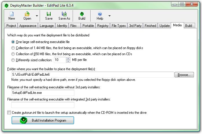 Key features of the installation builder: * Fully GUI-driven. No need to learn another scripting language. * Can build packages from the command line, so you can use it with your make tool. * If you need more power, build a support DLL in your favorite programming language. C and Pascal sample sources included. * The interface of the setup package can be completely translated into any language. The language files can be edited by a translator with nothing but a text editor.