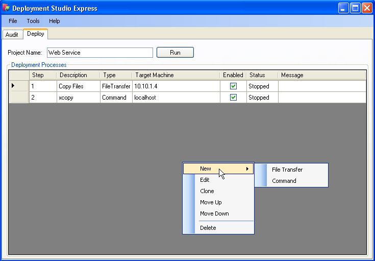 Automated Software Deployment Features - Deployment Studio Express can help streamline your software deployment process by providing your software deployment team with the ability to quickly and easily create re-useable deployment profiles. Tasks can be created to run remote commands on target systems (stop/start services, run DOS commands, execute batch scripts, etc), deploy files/directories to the target systems, build applications from source control, etc.