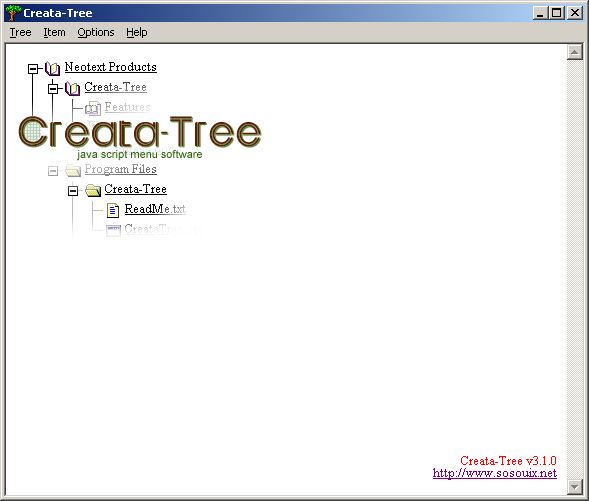Creata-Tree creates one of the most powerful JavaScript menu trees available for your web site. It comes complete with installation and un-installation. The program has a nice tree view for you to layout items and it's very straightforward. Creata-Tree requires only basic HTML skills. The dynamic tree works in browsers Internet Explorer 4+ and Netscape 4+. All other browsers view a nice static layout of the tree. Why JavaScript? By using JavaScript and keeping the code as open source, developers can manipulate the tree as they wish (see tree code for copyright info). All objects and functions are accessible through other code on your web site, giving developers the ability to dynamically alter the trees properties from any page on their site. Why not Java? Java Applets can be clunky and slow loading on older systems. Given all the customization and ability in Creata-Tree, as a Java Applet, it would be VERY slow. Why NeoText? We work hard to bring you the MOST customizable Tree on the net. Many companies and code can compare to one style of tree, with minimal ability. However our tree can do it all, from Explorer trees to Macintosh trees. If it has been done, Creata-Tree can do it. Creata-Tree can even do simple menus with out a tree design.
