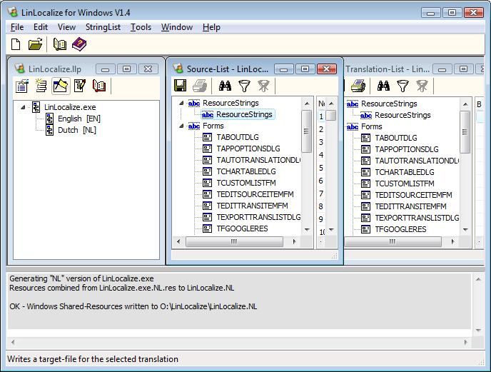 LinLocalize for Windows is a translation tool running on Windows for easy localization of your Delphi-applications. Linlocalize extracts all embedded Delphi-resources (resource strings and forms) of a Windows-PE-file (Portable Executable: shared-object-file/dynamic-link-library or executable) and writes the translated texts back to a shared-resource-file or standalone executable. Translate your Delphi-applications within one translation-tool and use the same glossaries for automatic translation. To localize for different languages, you may have to convert hard coded strings in your Delphi-source-code to resourcestrings. Version 1.5 is written in Delphi XE, using the VCL. Probably, it can be compiled using Delphi 2009 or later, but not by earlier versions, because it needs Unicode.