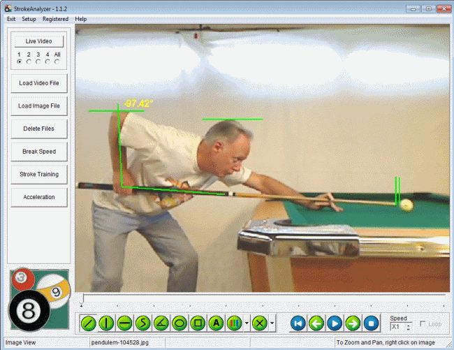 StrokeAnalyzer helps you identify and correct flaws in your pool stroke by utilizing video recording and playback. On screen markup tools allow you to monitor the flaws in your stoke. This visual feedback is extremely important in seeing and correcting stroke flaws. Stroke Analyzer requires only a computer and inexpensive webcam for recording. Different video camera angles can be utilized to see stroke flaws in all critical axis of stroke mechanics. Also includes Break Speed analysis to determine your breaking speed. StrokeAnalyzer can also be used to record and analyze other sports such as baseball, golf, bowling and tennis.