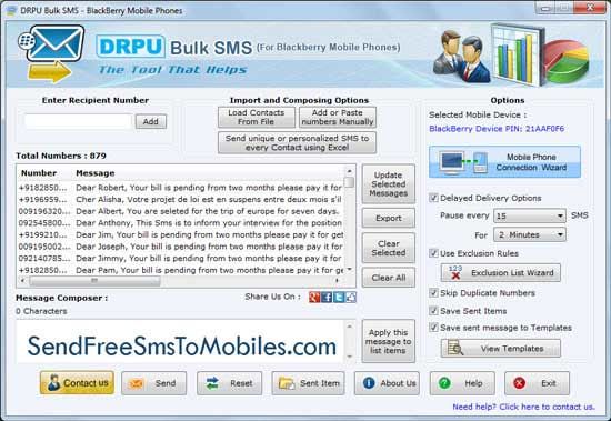 BlackBerry SMS program helps you to expand your business across the world and attract new customer through broadcasting promotional or advertising messages. Text Messaging Software for blackberry allows to deliver standard SMS and notification from computer via blackberry mobile with option to save all text messages at specific location on PC. Send multiple text SMS to individual or group of contact number using BlackBerry SMS Sender Application.