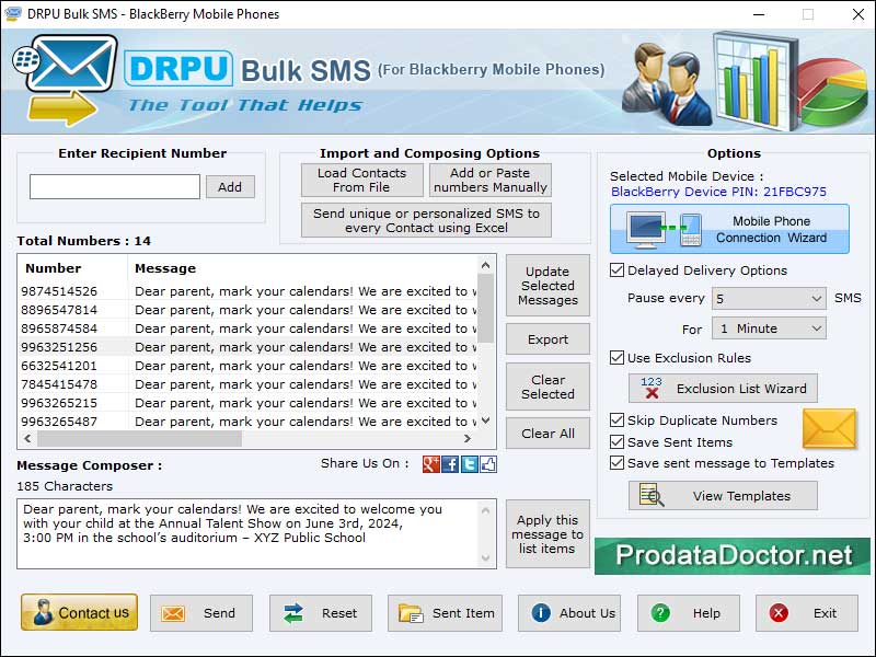 Visit on our company website www.prodatadoctor.net and install blackberry text sending software it allows you to sends thousands of text messages within few easy steps with using any internet connectivity or technical supports. Bulk SMS for Blackberry Mobile tool sending personalized text messages to user mobile using excel sheet.