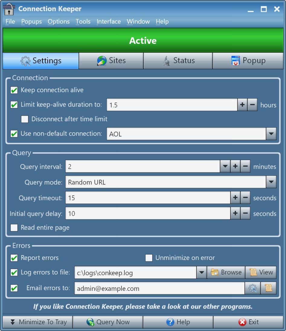 Connection Keeper is an invaluable time-saving tool for dial-up users. This free program simulates Internet browsing (at a random interval) to prevent the connection from appearing idle, thus preventing your ISP from dropping the connection due to inactivity. Connection Keeper can also automatically close many types of popup windows, such as those asking if you wish to stay connected. And if the connection is lost, Connection Keeper can automatically dial back in, restoring the connection as fast as possible. It can also monitor websites, DNS records, DNS blacklists, FTP files, SMTP servers, and POP3 servers. Save your time and sanity - try Connection Keeper today.
