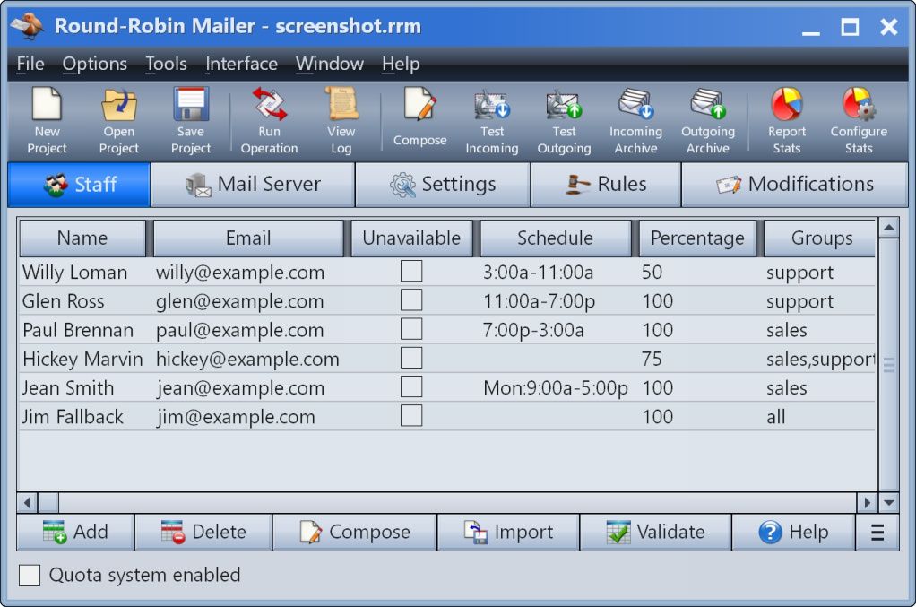 Does your company have a sales staff? Do you have leads arriving by email? If so, you probably need a solution that distributes those leads promptly, reliably, and fairly to your staff. Round-Robin Mailer is designed to do exactly that. It connects directly to a POP3/IMAP4 mail server, reads all email, and forwards each one to a member of the staff in a rotating fashion. Because we understand how important leads are, Round-Robin Mailer is designed for maximum reliability. It is guaranteed to never lose an email. Other features include statistical reporting, archiving, staff scheduling and favoritism, and a rules-based system for handling certain types of emails differently.