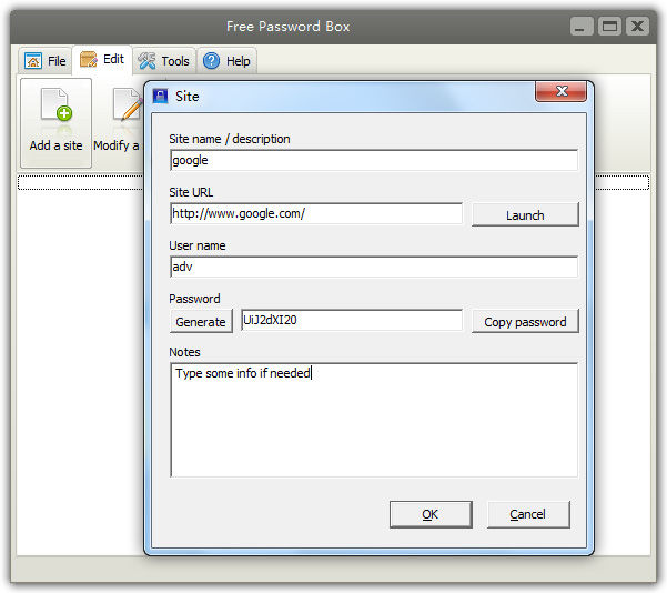Free Password Box is integrated with an inbuilt password generator which can generate random and strong passwords using letters, numbers and characters with different templates.