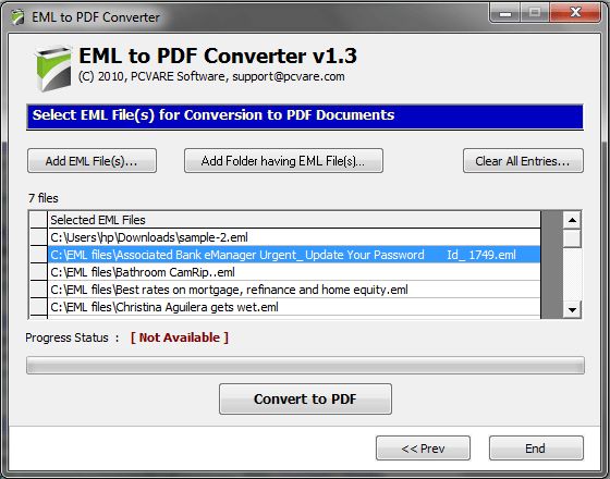 Are you looking for software that helps you to convert EML Emails to PDF? Need to convert EML Emails to PDF? Use PCVARE EML to PDF Converter tool that helps users to move EML Emails to PDF. The EML Emails to PDF tool is made to convert EML emails from Outlook Express, Mac Mail, Thunderbird, Apple Mail, Windows Mail, Windows Live Mail, Vista Mail, Entourage, etc to Adobe PDF. The EML Emails to PDF tool convert all the Meta Data of EML files into PDF (to, Bcc, Cc, from, attachments, formatting, sent and received email data, etc). The software is windows based application ??“ Windows 2000, 2002, 2003, 98, 97, XP, ME, Vista, etc.