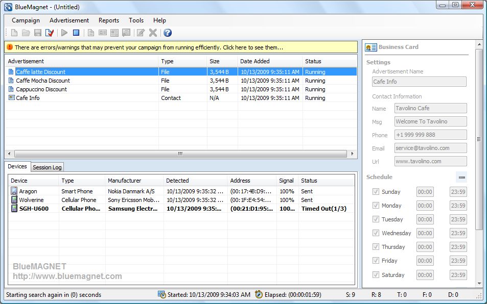 BlueMagnet is a Advertising software (Proximity Marketing System). With this software, you can advertise your business and take it to a new level that you couldn't even imagine that it's possible. And best of all, you will not have to pay a penny. Studies show that a very high percentage of possible customers now are carrying cell phones that are Bluetooth-enabled (Up to 80%). BlueMagnet relies on this fact to work as a devoted employee to your business. It will keep monitoring your business area waiting for a new possible customer and when this customer approaches, it will offer him to receive a video, a photo or even your business card.