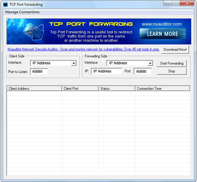 Tcp Port Forwarding tool allows to capture and redirect TCP traffic that flows through a particular port. Tcp Port Forwarding software also can work as network bridge for redirecting TCP network traffic from one network card to another one. This tool is used for testing some services, firewall and intrusion detection systems. The program can also be used for debugging programs and configuring other network tools.