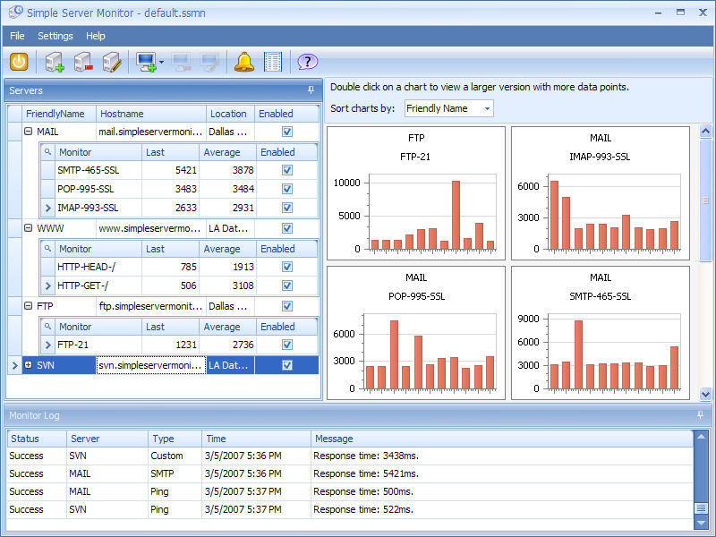 Simple Server Monitor is a powerful, yet easy to use network server monitoring utility. It allows you to monitor the status of your servers and web applications from your desktop. Simple Server Monitor runs as a Windows Service with GUI monitoring console. When a monitor fails, you are notified by a pop-up message, an e-mail alert (user customizable messages), and/or a sound alert. Supports Ping, HTTP/HTTPS, FTP/FTPS, SMTP/SMTPS, POP3/POP3S, IMAP/IMAPS, and Custom monitors (supports SSL/TLS). Simple Server Monitor also supports performance monitoring by charting the monitor response time and by logging (optional) all monitor queries to a log file and/or the event log.