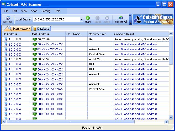By sending ARP queries to the specified subnet and listens to the ARP responses, Colasoft MAC Scanner can list IP addresses and MAC addresses with their correlation in seconds.Scan results can be edited and attached with attributes showing where is the host and who is the user. Moreover, with its database feature, scan results can be easily maintained as database records. By automatically comparing new scan results with the records in database, Colasoft MAC Scanner can instantly identify alien network equipment which does not belong to your local network.
