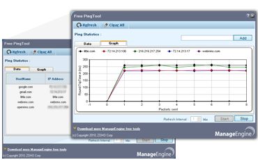 The ManageEngine Free ping tool gives the round trip time in a intuitive moving real time graph. Graph is drawn with Number of instances in the X-axis versus RoundTripTime (ms) in Y-axis for multiple hosts. The graph is drawn over the specified refresh time Intervals.
