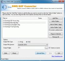 DWG to DXF (DWG to DXF Converter) is a batch DWG and DXF bi-directional converter that allows you to convert DWG to DXF, DXF to DWG without the need of AutoCAD. It is also an AutoCAD drawing file version converter, it allows you to choose the AutoCAD version of the output DWG and DXF file.