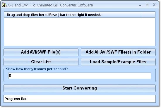 Change multiple AVI or SWF files into animated GIFs. Drag and drop the AVI/SWFs files into the software and then click a button to start the process. There is a feature to specify the number of AVI/SWF frames per second in the animated GIF output. Output files will be put in the same folder as the source files.