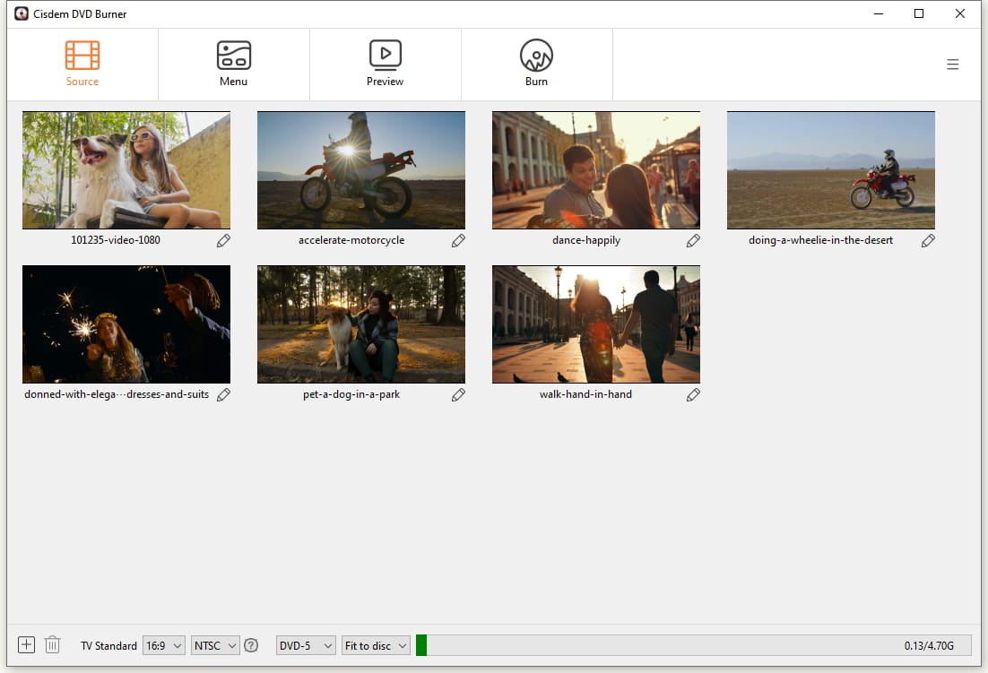 Cisdem DVD Burner is a robust and easy-to-use DVD burning program for Windows 11/10. It can burn videos from any format to DVD disc, VIDEO_TS folder, or ISO image. There is a built-in video editor and DVD menu creator to help you make a beautiful and professional DVD as you like. What's more, it allows you to preview all edits and changes before DVD burning. Use it to burn a playable DVD on Windows PC with high quality and speed.