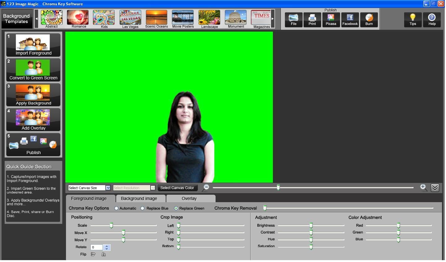 123 Image magic is a user friendly chroma key software that enables you to edit, replace green/blue screen background from your images easily. Capture/Import images to canvas and you can select the size of the final output image as needed. Mask option for images and In-built Image editing options is also present in this software. Features of 123 Image Magic are:- * You can replace Green/Blue screen background from images. * You can edit your images easily within the application. * You can resize, crop, rotate or flip the image. * Also, you can change the position of any image easily over the canvas. * No need to depend on any other image editing software to create beautiful pictures now. * With in-built overlays, you can add your images on the cover page of magazine covers easily. * With 123 Image Magic you can easily adjust multiple images with various image adjustment options. * You can adjust the brightness, contrast, saturation of the image. * You can adjust the red, green and clue balance of your image files. * You can upload your pictures directly to your FaceBook and Picasa account and share it with your family and friends. * You can easily print your images directly to the printer. * Select the image and printer and your images will be printed directly from the application. * You can save your images easily on CDs and DVDs. * With 123 Image Magic, you can burn your images as well as other files to CD/DVD's instantly. * You can preview all your images directly and can make changes in it. * It has a very easy to use, simple user interface. * With all the options on the single screen, you don't have to depend on anyone to learn the software and use it. * With Filter and effects you can remove noise present in the image without blurring the image edges. * With Decorate option you can decorate the image by changing frame resolution, ranging from 20X20 up to 60X60.* With Fill color option you can apply effects such as Negate or Grayscale.
