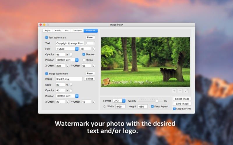 Fine-tune, watermark, resize, rotate, convert and apply artistic effects to your photos using Image Plus. If you have photos on your Mac that need to be adjusted and watermarked then you are in luck. Image Plus is an all-in-one photo processing solution that any photographer or graphics designer should have in his toolset. But here is what Image Plus has to offer: