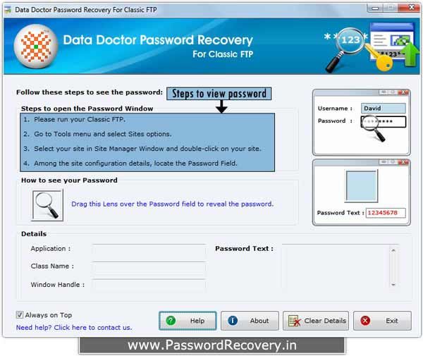 Classic FTP Password Recovery utility supports all types of Windows operating system for better functioning of program for salvage of damaged authentication information including username, password information in user friendly manner. User just scroll the imaginary lens provides in software to the password text field area and that??™s it entire password information is revealed in text format as well as appears in separate text area.