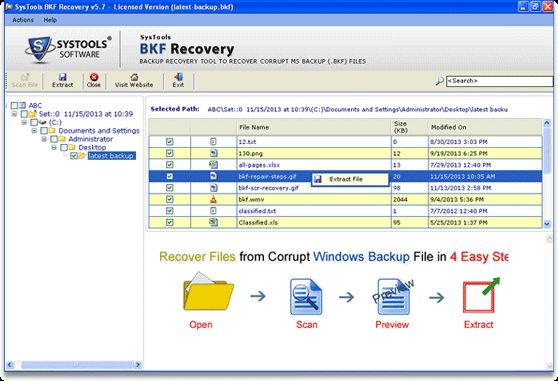 Use MS backup recovery software to extract backup database and repair corrupted BKF files. It is a reliable application to repair MS backup file after corruption that has been corrupted by virus attack, system failure and human errors. This Microsoft Backup recovery software has brilliant features such as quick scanning, deep scanning, range based scanning through which can extract database without losing the original details with full version. So, extract backup database with versatile Microsoft backup recovery tool which successfully supports up to 300 GB at one time. For large sized backup database, you can use range based scan features that repair small portion of corrupted data from a large corruption data. Now, you can easily extract backup database by using Windows backup tool, VERITAS backup tool etc. Software can supports all Windows Operating System (98, ME, NT, 2000, XP, Vista, Windows 7 and Windows 8). Download Demo version to know how it works. You can purchase this software at just $89.