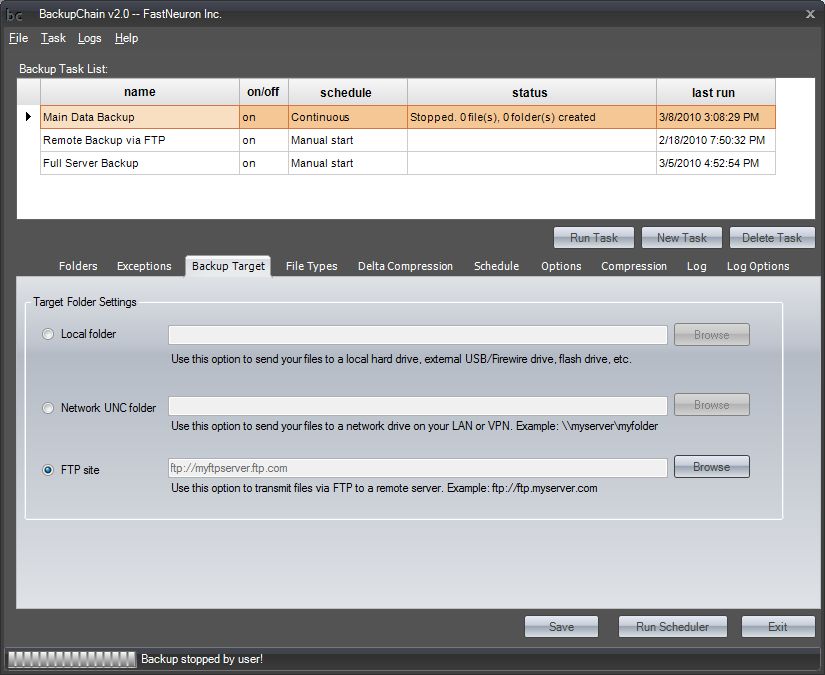 BackupChain performs fast incremental backups to external hard drives, network drives, and FTP. The built-in FTP server permits receiving backup files from another computer.