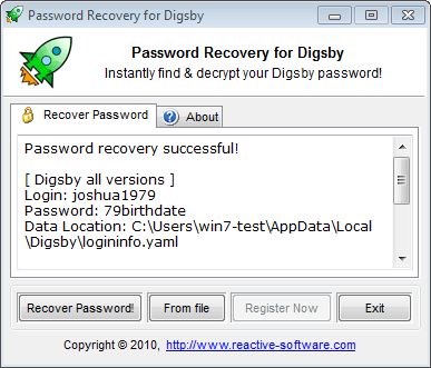 Password Recovery for Digsby is a tool that will find and decrypt Digsby account passwords stored on your computer. This Digsby password recovery tool works if you are able to login to your Digsby account without entering your password (saved password checkbox ticked). Recovery from external Digsby user data files is also possible which means you can copy the profile data from another computer or from a crashed hard drive and rip Digsby passwords from it. All you need to do to recover your saved Digsby password is to download Password Recovery for Digsby, install it and click on the Recover Password button.