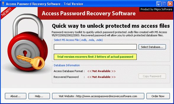 Software to Recover Access Password is very powerful Access Password Recovery Software to recover Access database password in a simplest way. Recover Access password software enable users to unprotect access database& to recover access password from locked Access database. Recover Access Password is useful for database administrators to unlock access database files easily in just 3 clicks. Access database password recovery will display the lost password from protected MS Access database in just few seconds. Access Password Recovery software to recover access password & retrieve ms access password from protected access databases created with MS Access 95/97/2000/2002/2003. Software recovers access password having multilingual characters easily. Software to Recover Access Password recovers complex & lengthy passwords easily. Software helps user to retrieve forgotten access database password from locked access database. Users can run the Software to Recover Access Password on any version of Windows 98/ME/2000/2003/XP/Vista. Software to Recover Access Password is available for free for evaluation. If satisfied, get the full version to recover ms access password easily.