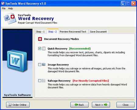 Word Recovery Software provides easy and quick process of Damage Word Data Retrieval and removes Word errors. Software??™s User friendly interface helps users to open damaged Doc Document confidently. Software offers you three type of recovery mode to Retrieve Corrupted Word File.