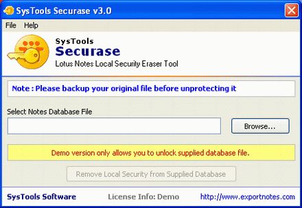 Tryout Security Removal Tool which can help with powerful features to Remove Local NSF Security from IBM Lotus Notes Database file. Use NSF Security Removal tool to Open NSF files locally which have been protected by database owner. Removing local security from NSF 8.5, 8.0, 7.0, 6.5 and 5.0. Now you can read NSF file after using security removal tool and best Lotus Notes NSF Security Remover program efficiently and successfully runs on Windows 98/ME/2000/2003/XP/Vista/Windows7 OS. If you know more about this Securase software and wants to know how to it works then you can use demo version of software before purchase its full license version. For full fledge process, invest in full operative version of NSF security removal tool at just only 49 dollars. If you have any technical issue in your mind regarding Securase software then you can ask with our professional support team at any time (24x7) without any hesitation. Read more: http://www.securase.com/modify-secure-nsf-files.html