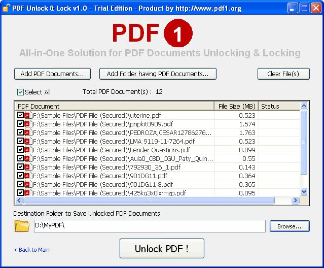 Do you want to unlock PDF password security from protected PDF files? Get PDF Unlock program, perfect tool that lets users unlock PDF password security. The software is a smart program that allows to successfully unlock PDF password protection without altering the original PDF file. Using this efficient and speedy program users get the authority to unlock PDF password security from thousand number of PDF files in swift approach. Get this handy tool to easily unlock security password. PDF File Unlocker is an expert tool that unlock PDF password protected files without any extra technical skills. Want to know how to unlock password protected PDF, free software version can be easily downloaded which can guide you how to unlock PDF password security and lets you remove PDF security from first 2 pages of the PDF. if you wish to unlock PDF password security from batches of PDF files in instant go, get the licensed edition of PDF File Unlocker only at $9.