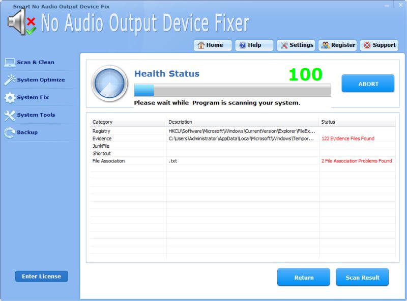 Smart No Audio Output Device Fixer Pro is a complete program that can detect any problems with your computer and how it functions. Here are the features of this product that can clean and fix your computer and have it running at its maximum in no time. There are a lot of pros for Smart No Audio Output Device Fixer Pro. It will diagnose and fix any problems within the computer system. This will help the computer run a lot faster. Plus there are a lot of features that help make the user experience more enjoyable. Another pro is that it actually protects privacy and computer as well.It walks you through your options so that they are not overwhelming. Another plus is that you don't have to wait for something to come in the mail. Download it quickly and have your computer running faster in no time at all. It has also been observed that this is a very popular registry cleaner in many homes. After using this registry cleaning application, many users have witnessed fast operating PC than before. This means therefore that it measures up to what the company claims it can do and exceed the consumer's expectations. It has another advantage that is you can have a time schedule and Smart No Audio Output Device Fixer Pro will scan and optimize your computer automatically. Running this tool on a scheduled basis, will result in a stable system and will greatly enhance system performance. The scan technology helps the user quickly identify errors and invalid entries that cause the computer to slow, freeze or crash. Over 9,500,000 people have already chosen Smart No Audio Output Device Fixer Pro to fix pc error! You can just fix No Audio Output Device Is Installed error with 3 clicks: 1. Download and Smart No Audio Output Device Fixer Pro. 2. Click "Quick Scan" button to scan your computer. 3 Click the "Repair All" button and then Internet Explorer errors and problems will be gone completely! Simple procedure, amazing effect!
