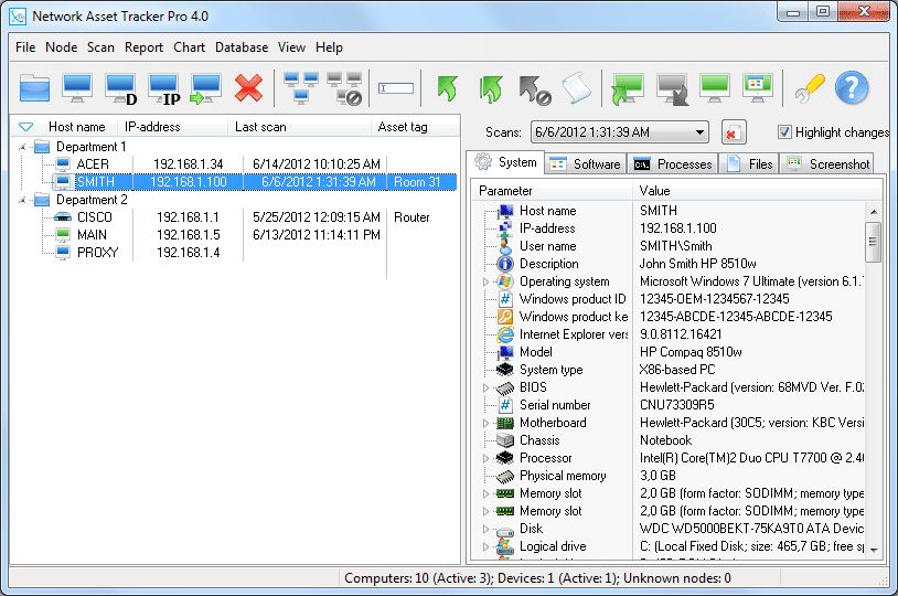 Network Asset Tracker Pro is a comprehensive network inventory solution that enables you to scan all the nodes of your network with just one click. Get complete information about operating system, service packs, hotfixes, hardware, software and running processes on remote PCs. You can capture a full-size screenshot of any remote desktop. Powerful reporting module helps you save a lot of time for preparing asset reports.