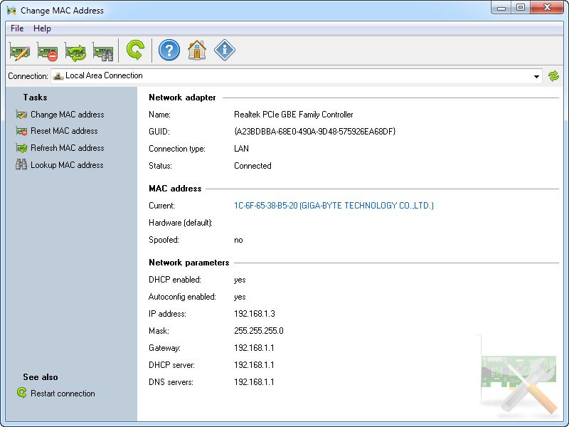 A powerful and simple tool for changing the MAC address of a network adapter. You can spoof the MAC address, set the MAC address of another manufacturer or generate a random MAC address in just several mouse clicks. Your changes will be applied at once and they will be retained after you restart the system.