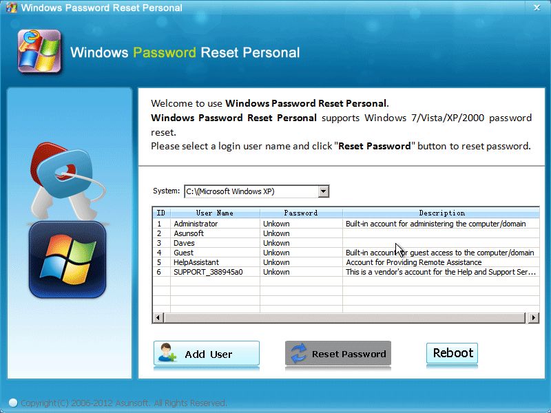 How to bypass Windows XP password? Asunsoft provides the best Windows password recovery tool to help you bypass Windows XP administrator and common user password without data lost. When you forgot your Windows XP login password, this software is useful for you to bypass windows XP password without data lost. To bypass Windows XP password with Windows Password Reset Personal is the easiest and secure way to regain access to your computer. You just need three minutes. Key Features: 1. Bypass Windows XP admin and user's password by resetting password. 2. Bypass Windwos XP password by creating new user offline. 3. Support all versions of Windows like Windows 7, Vista, XP, 2008, 2003, 2000. 4. Support a variety of file systems including FAT16, FAT32, NTFS and NTFS5. 5. Support many types of hard disk like SATA, SCSI, IDE hard disk and RAID. 6. Comes with Graphical User Interface, only a few clicks required to reset Windows password. 7. Windows password can be reset in a few minutes, no matter how long and complicated it is. 8. Read-only and no-destructive deigns to ensure 100% security. No any data loss or damage.